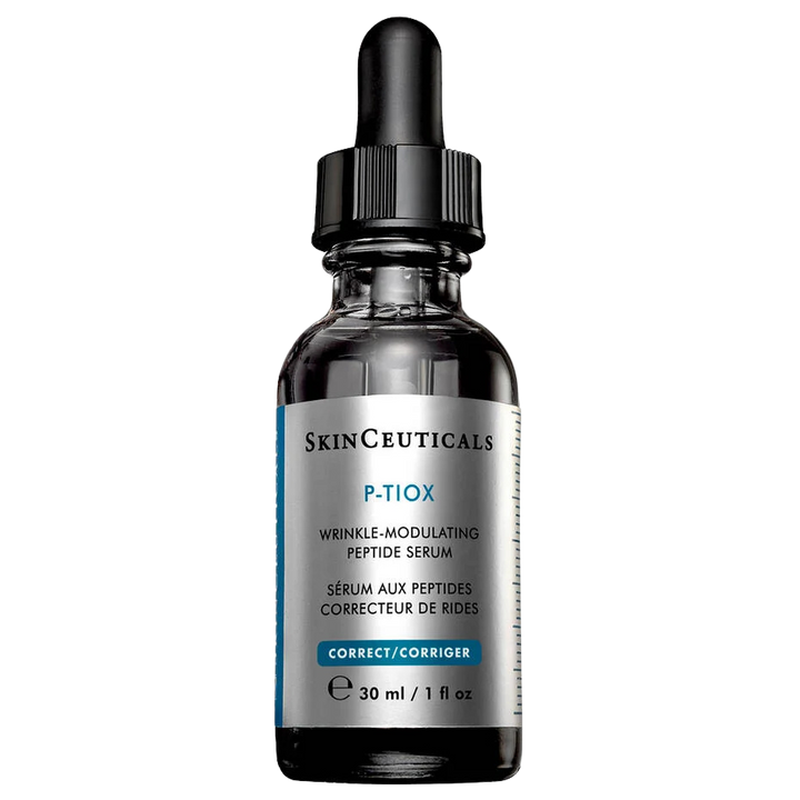 P-TIOX by Skinceuticals is a needle-free anti-wrinkle peptide serum proven and tested more powerful than peptide-based formulas alone to maximize anti-aging correction. P-TIOX is formulated with an advanced peptide complex, featuring amplified Argireline, and enhanced with Niacinamide, PHA & Laminaria Extract to visibly reduce 9 types of expression wrinkles, refine texture & pores, and reveal glass skin radiance. This innovative treatment can be used as a needle-free at-home solution for those not ready for injections or as an ideal complement to injections to maximize wrinkle correction in all facial areas, while improving overall skin quality.