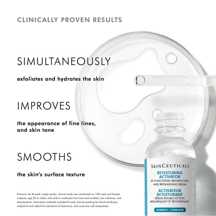 Retexturing Activator is a revolutionary exfoliating, replenishing, and resurfacing serum that helps reinforce the skin’s barrier for healthier, more radiant skin. Using patented technology, this unique resurfacing serum is highly effective in promoting gentle exfoliation while optimizing the skin’s amino acid supply to reinforce the external barrier and keep the skin hydrated. Formulated in an efficient oil-free delivery system suitable for all skin types to replenish, retexturize, and exfoliate skin for noticeably soft, smooth skin texture. This oil-free face exfoliating serum has the resurfacing power of daily 20% glycolic acid treatment.